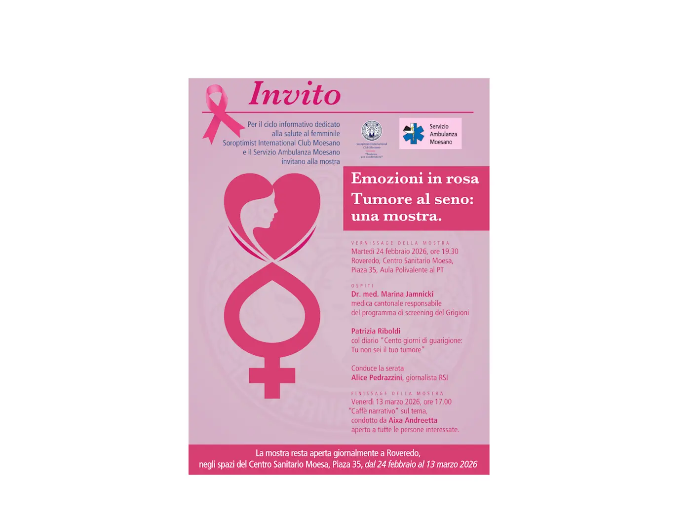 Il Club Moesano Soroptimist, in collaborazione con Ambulanza Moesano, presenta l’evento “Emozioni in Rosa”: una mostra fotografica accompagnata da libri e da una tavola rotonda dedicata al tema del cancro al seno.