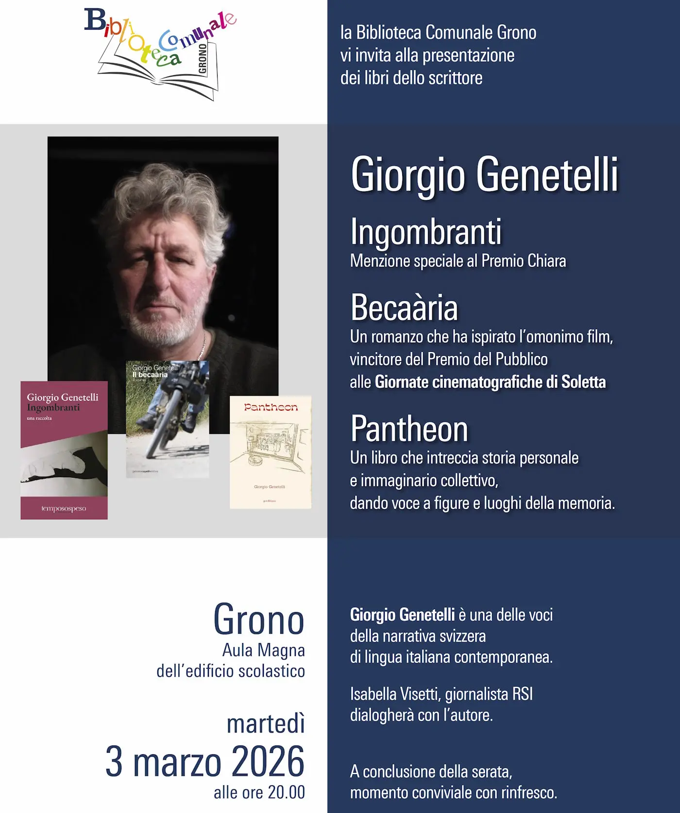 La Biblioteca Comunale di Grono, organizza per il 3 marzo 2026 la presentazione dei libri di Giorgio Genetelli, una delle voci della Svizzera italiana.
