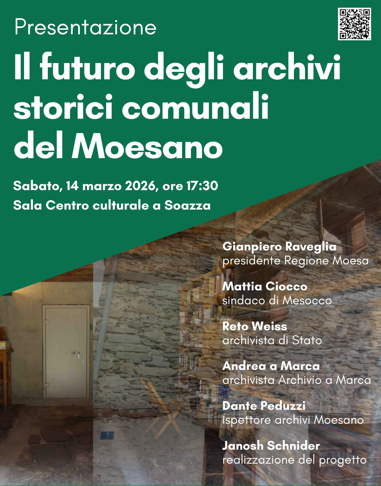 L'iniziativa illustra l'accordo del 2023 con cui il Comune di Mesocco ha depositato il proprio fondo (periodo 1219-1799) presso l'Archivio regionale a Marca. I circa 1500 documenti, pur restando di proprietà comunale, sono ora conservati in un ambiente climatizzato e sicuro.
