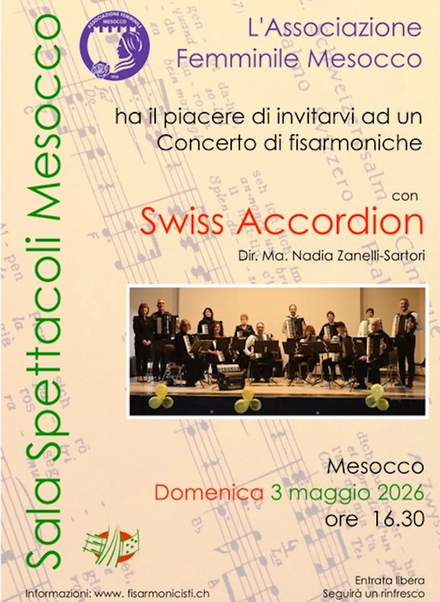L’ Associazione Femminile Mesocco ha il piacere di invitarvi ad un Concerto di fisarmoniche diretto dalla Maestra Nadia Zanelli Sartori, con musiche classiche e popolari eseguite dall'orchestra Swiss Accordion composta da una ventina di elementi provenienti da tutto il Ticino e dal Grigione italiano