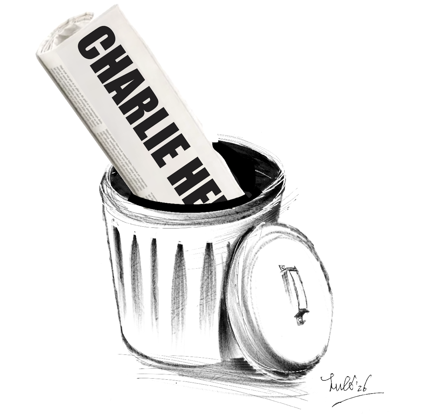 Un cestino della spazzatura con un giornale con il nome "Charlie Hebdo" in evidenza. La scena è disegnata in uno stile semplice e artistico.