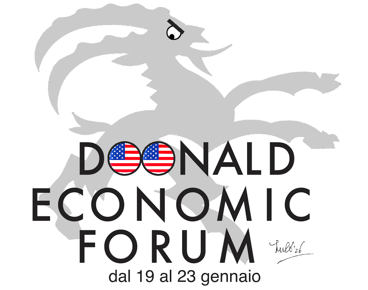 Un logo per il "Doonald Economic Forum" con una silhouette di un caprone e la scritta "dal 19 al 23 gennaio", accompagnata dalle bandiere degli Stati Uniti.