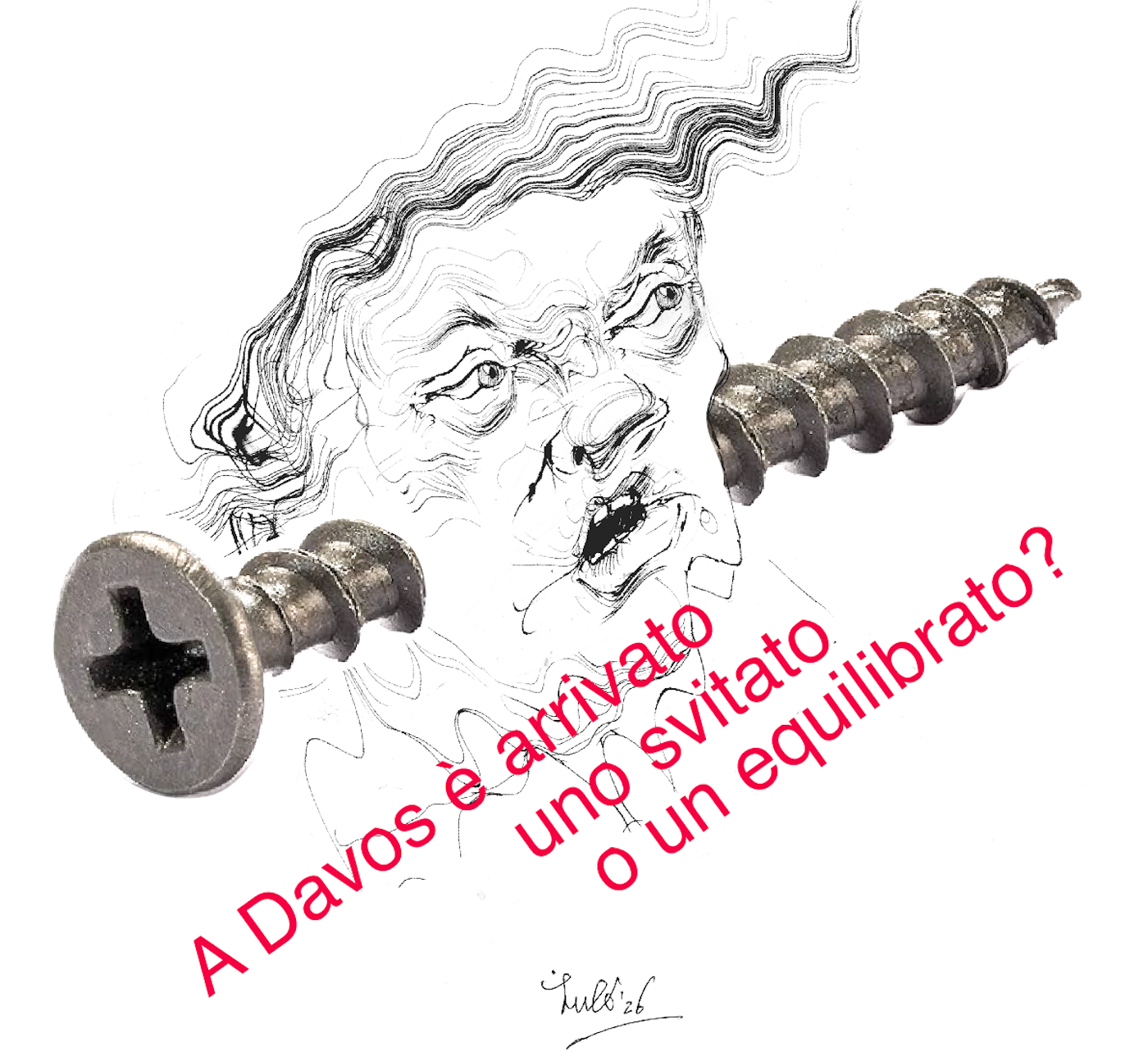 Un bullone d'acciaio in primo piano, affiancato da un'illustrazione stilizzata di un volto con capelli scompigliati. Testo rosso sopra: "
