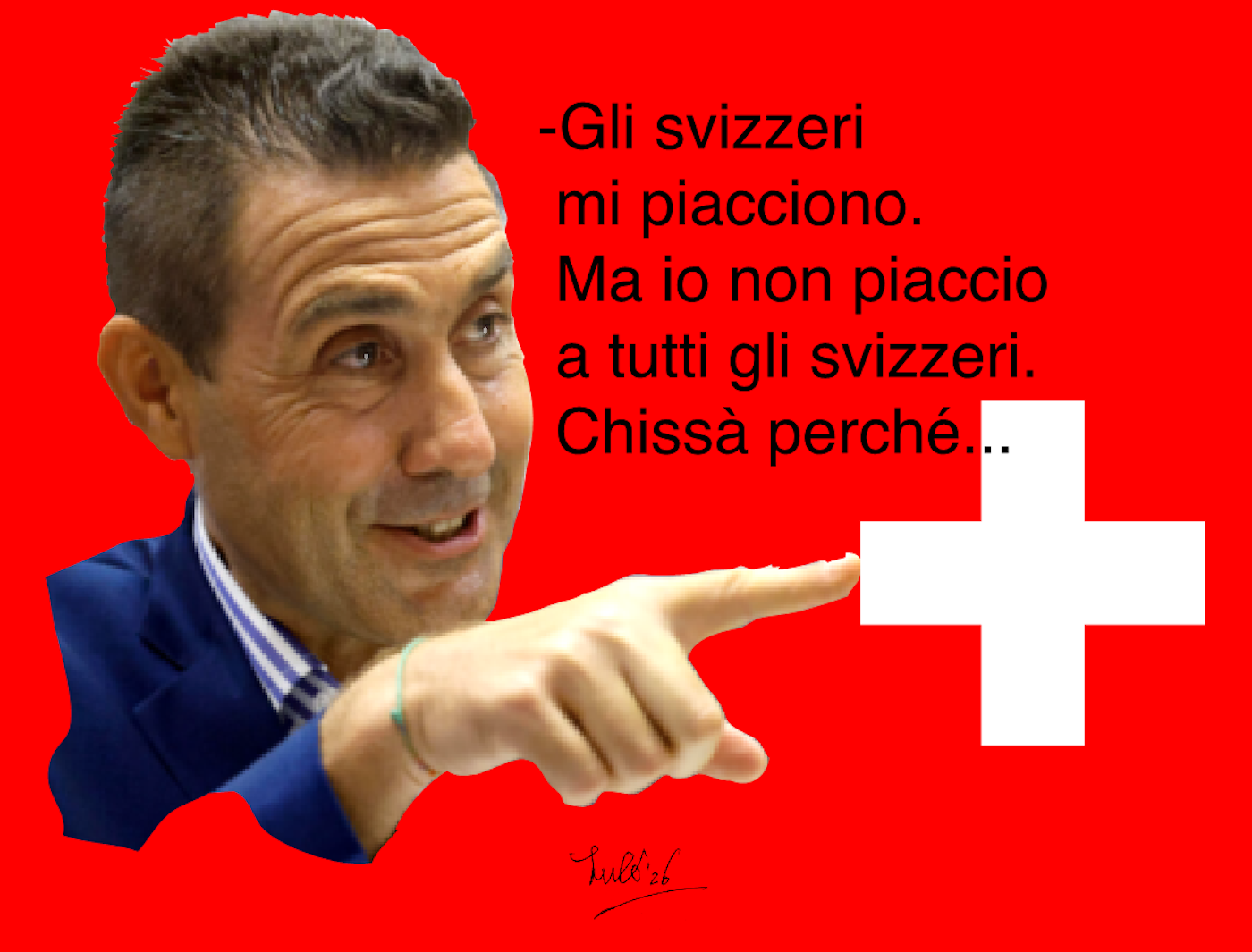 Un uomo sorride mentre fa un gesto con la mano, davanti a uno sfondo rosso con una bandiera svizzera. Sullo sfondo ci sono delle frasi che esprimono