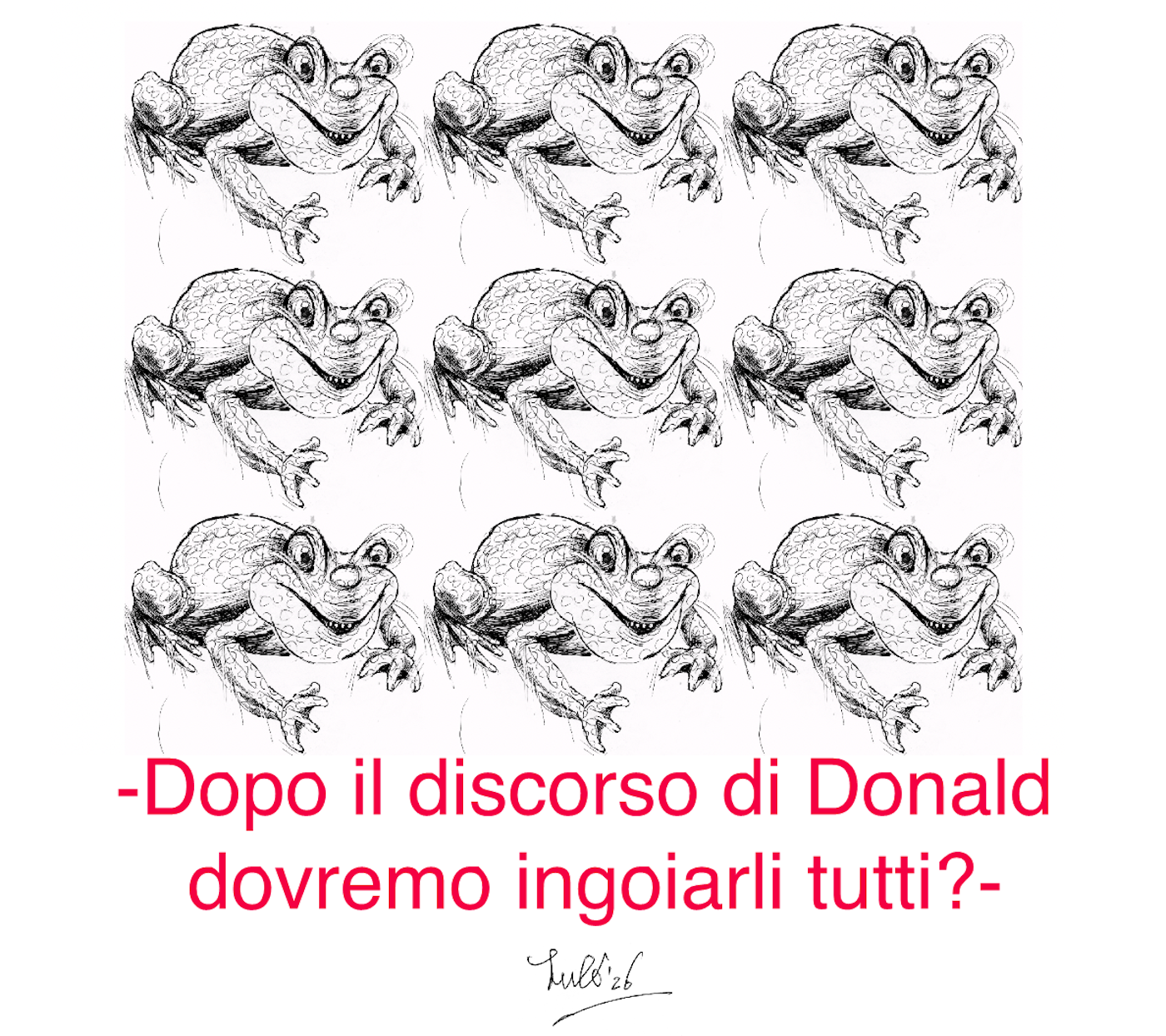 Vari rane disegnate in stile cartoon, con espressioni sorridenti. Testo sottostante: "Dopo il discorso di Donald dovremo ingoiarli tutti?"