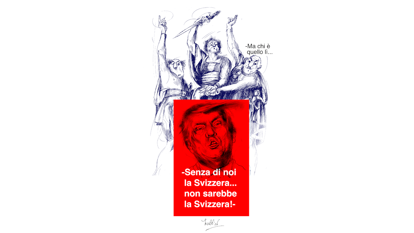 Un'illustrazione umoristica che mostra figure storiche in un contesto comico, con un cartello rosso che recita "Senza di noi la Svizzera... non