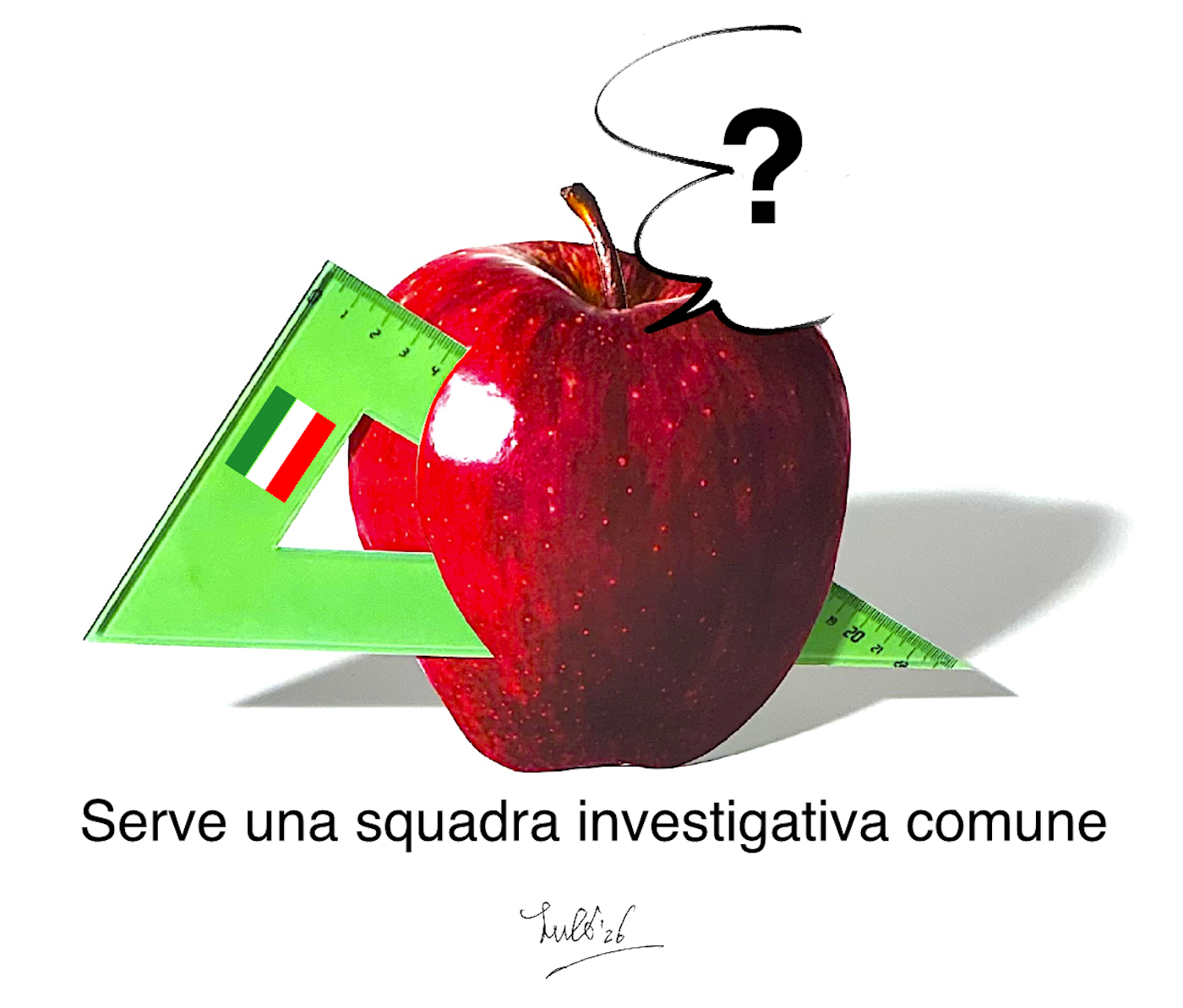 Una mela rossa con due righelli verdi a forma di angolo accostati e un punto interrogativo sopra. Sotto, la scritta "Serve una squadra investigativa comune".