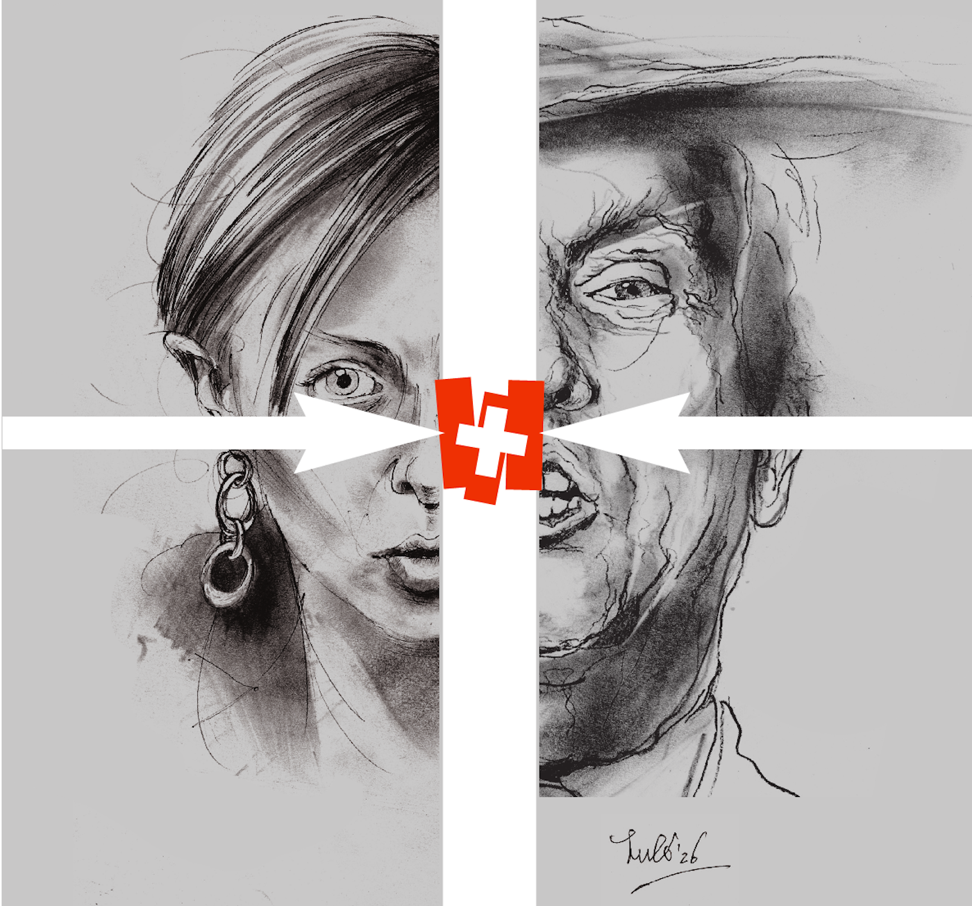 Illustrazione in bianco e nero che mostra due volti, una donna e un uomo, divisi da una croce svizzera rossa. La donna ha un orecchino