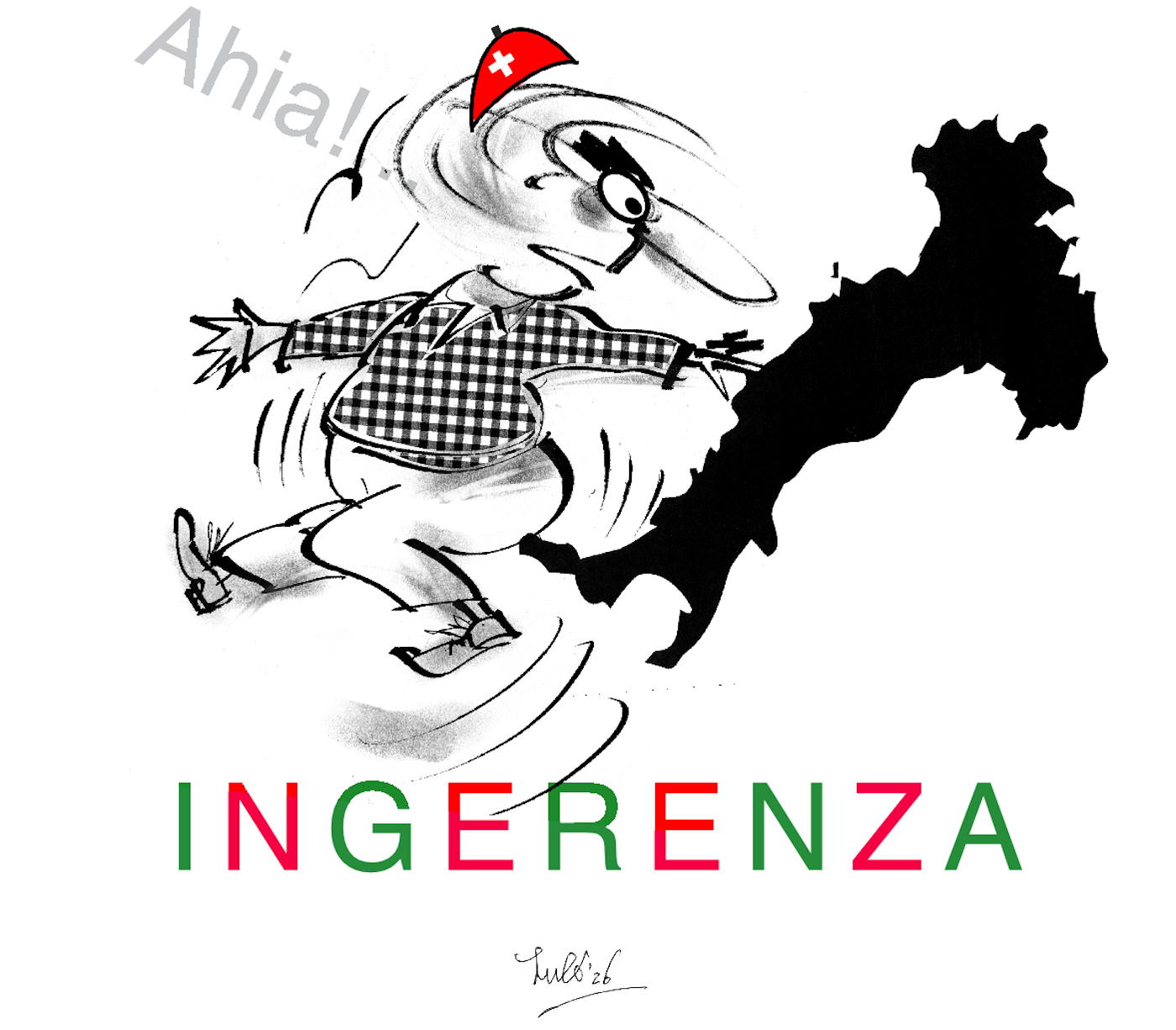 Un personaggio cartoonesco in abbigliamento a quadri, con un cappello svizzero, corre spaventato verso la sagoma dell'Italia, mentre la parola "