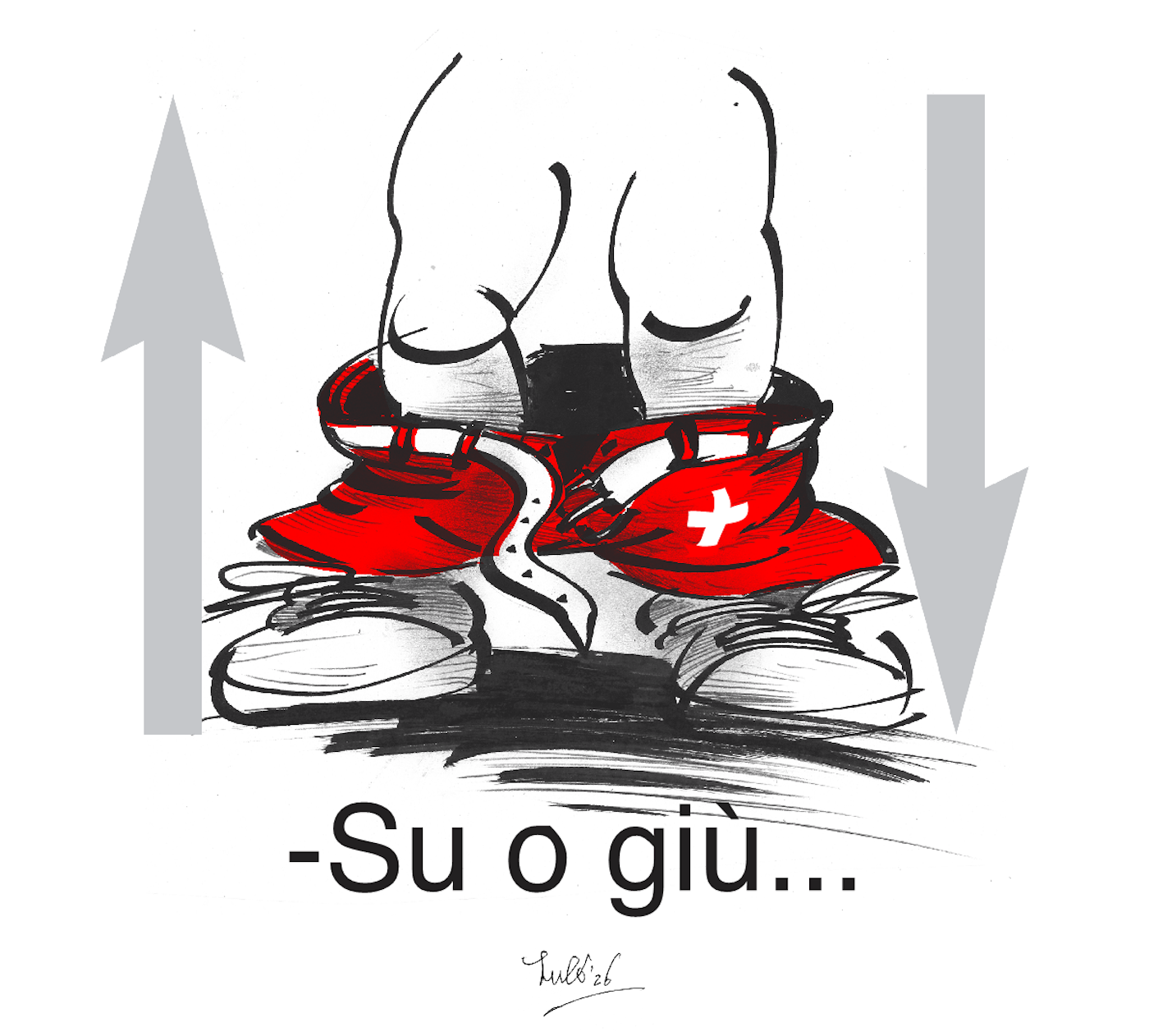 Piedi di un personaggio con pantaloni abbassati, ai lati due frecce che indicano su e giù, accompagnati dalla frase "-Su o giù...".