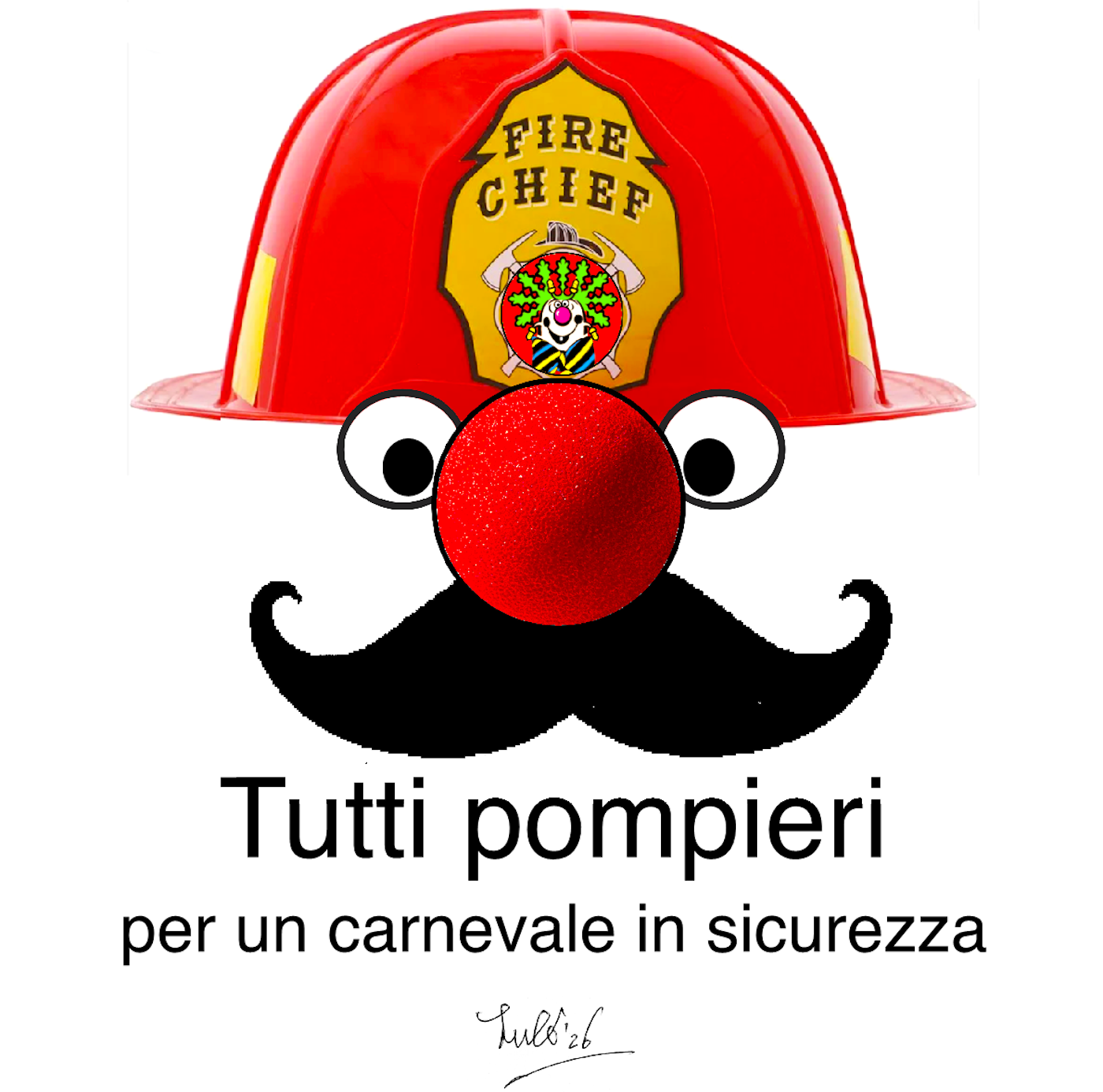 Un casco da pompiere rosso con un distintivo "Fire Chief" e un naso rosso da clown, accompagnato da occhi e baffi. Sotto, la scritta "