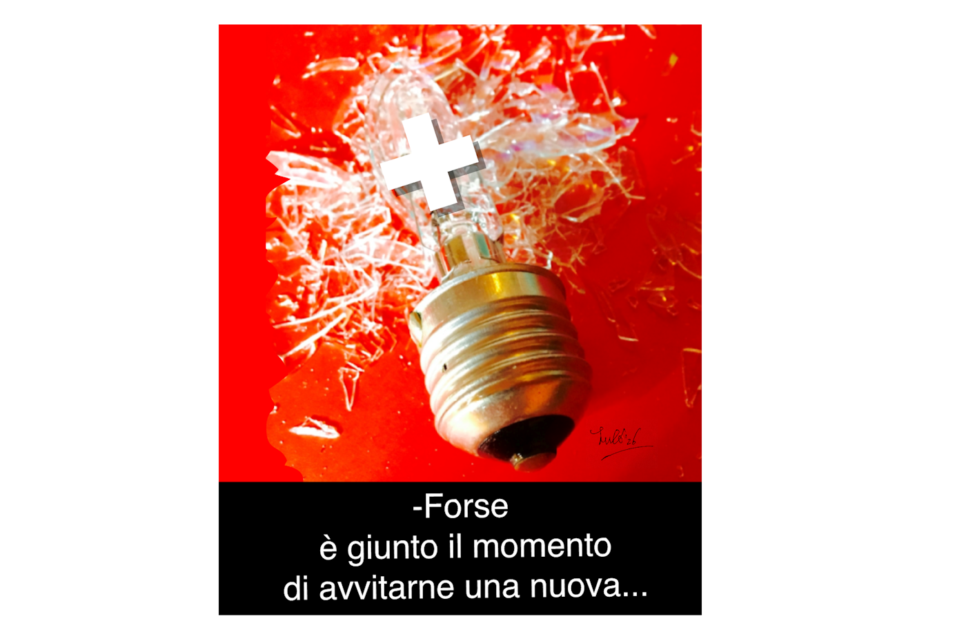 Lampadina rotta su uno sfondo rosso, con un simbolo di croce bianco sopra. Testo che suggerisce di avvitare una nuova lampadina.
