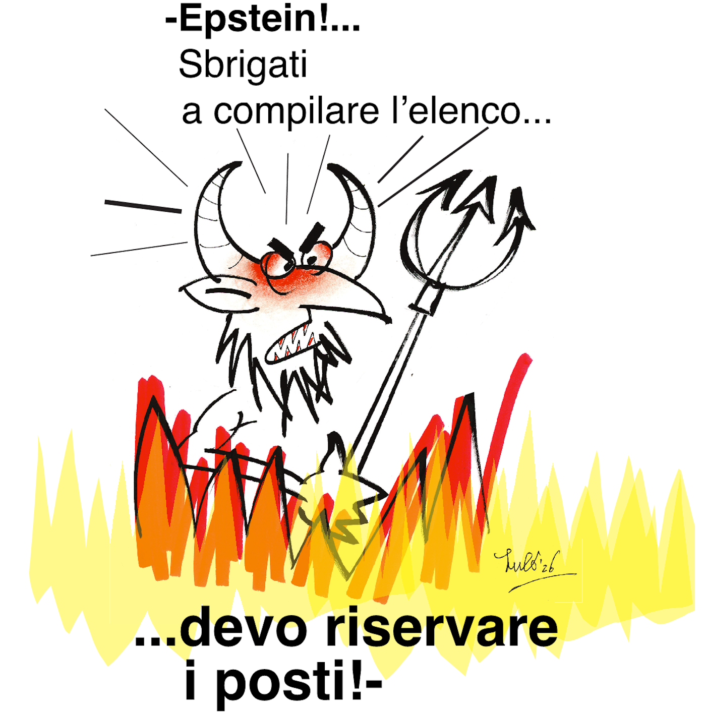 Un diavolo arrabbiato con le corna e un tridente, circondato da fiamme, ordina a qualcun altro di compilare un elenco per riservare