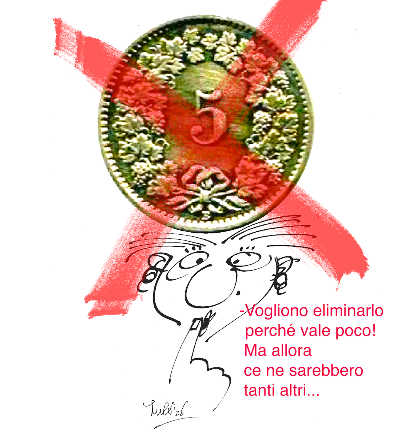 Moneta da cinque con un segno rosso di divieto sopra, accompagnata da un fumetto che esprime preoccupazione riguardo alla sua eliminazione, con la frase: "V