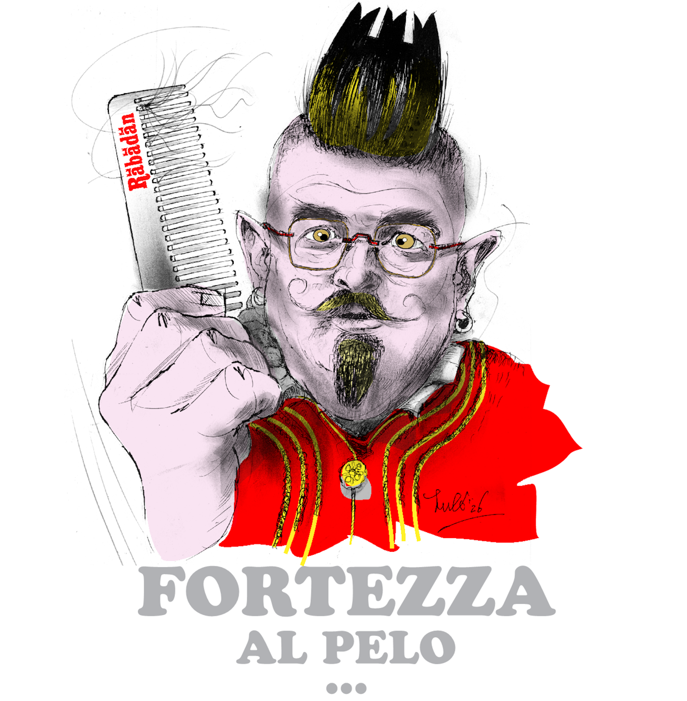 Un uomo con un'acconciatura mohawk e baffi folti tiene in mano un pettine. Indossa una giacca rossa e occhiali. Il design è colorato