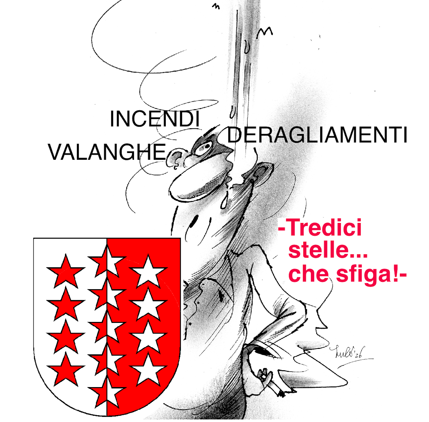 Caricatura di un uomo che piange con un'espressione esasperata, circondato da parole come "Incendi", "Valanghe" e "Deragliamenti".