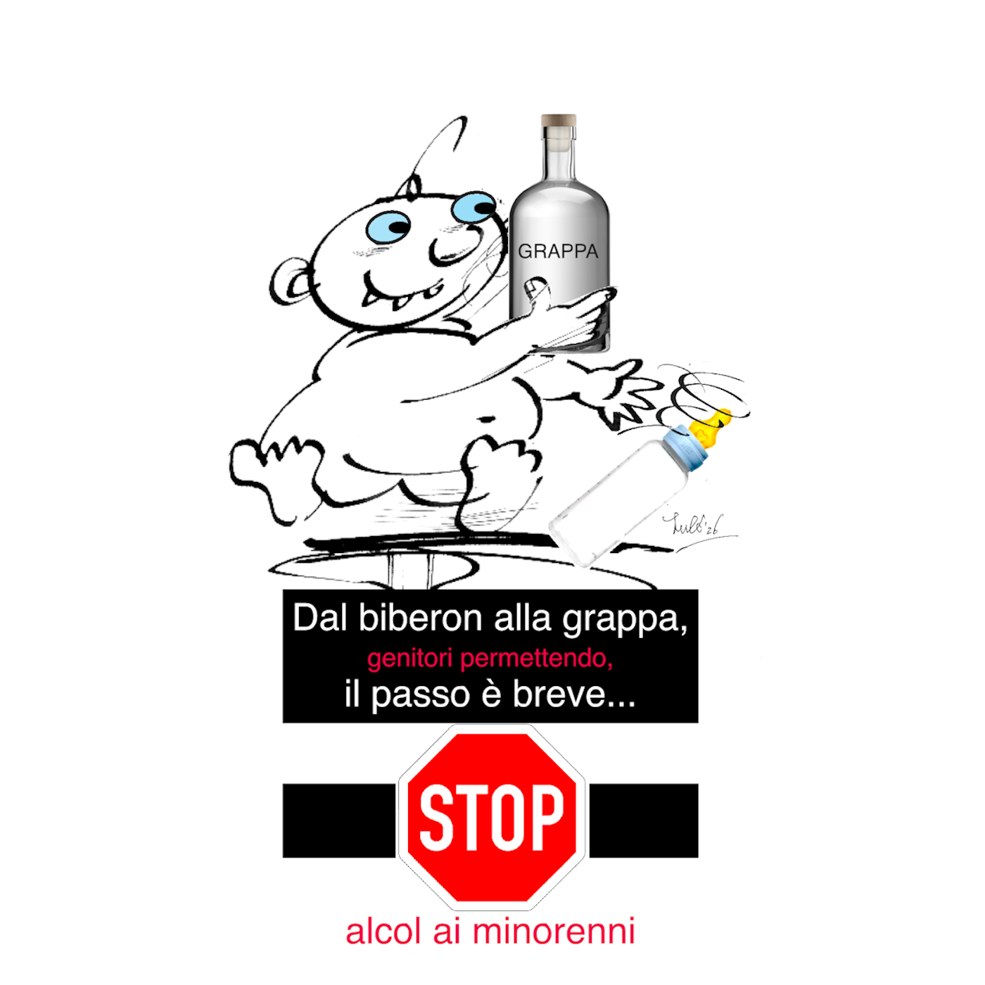 Un bambino disegnato che tiene in mano una bottiglia di grappa, con un biberon accanto. Un cartello rosso con la scritta "STOP" avverte contro l