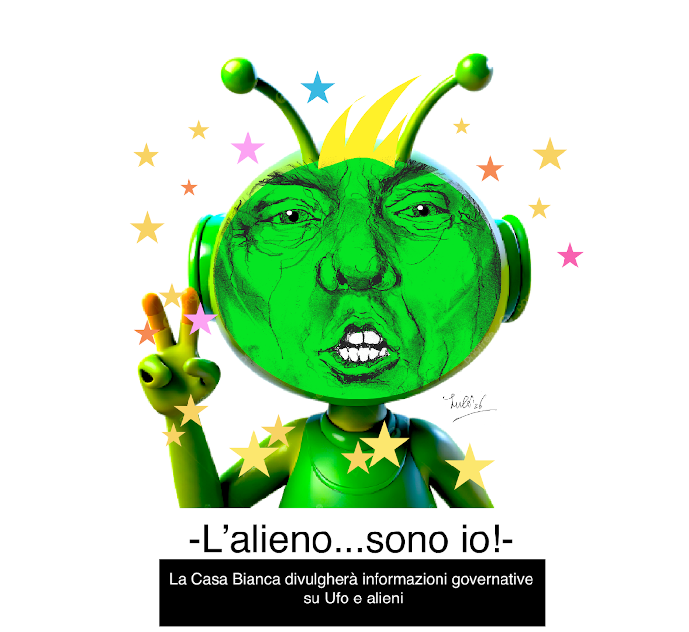 Un alieno verde con le orecchie a forma di antenna e il volto che ricorda un personaggio noto presenta un messaggio umoristico sulla divulgazione di informazioni sugli UFO e sug