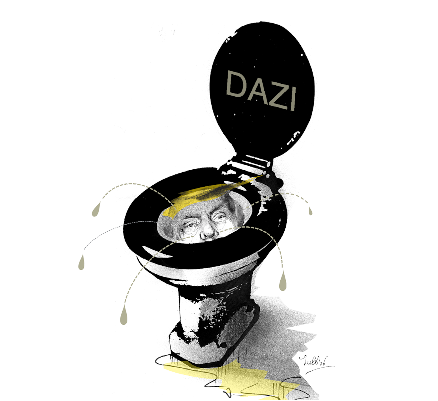 Un water con la scritta "DAZI" e un volto parzialmente visibile che sembra rappresentare una figura politica, accompagnato da gocce d'acqua che cadono.