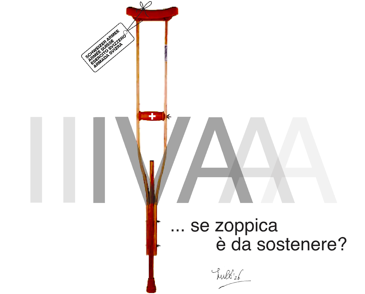 Una stampella rossa con scritte sovrapposte sullo sfondo e la frase "se zoppica è da sostenere?" in basso.