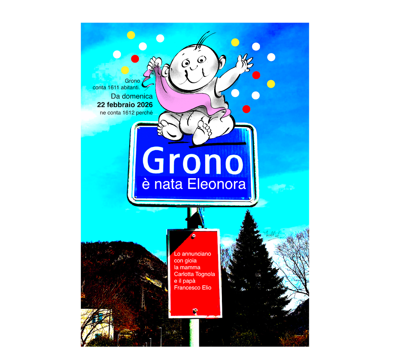Un cartello stradale con la scritta "Grono è nata Eleonora" e una caricatura di un bambino sorridente. La data del 22 febbraio 2026 è evid