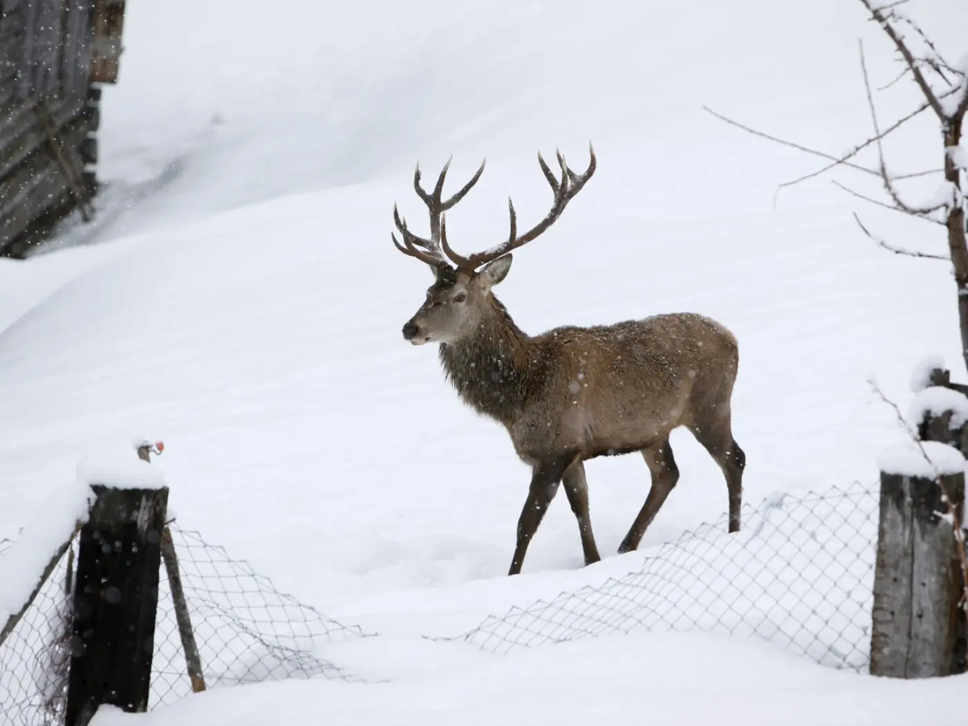 Un cervo maschio con corna maestose cammina su un terreno innevato. Neve leggera cade attorno a lui, creando un'atmosfera silenziosa e in