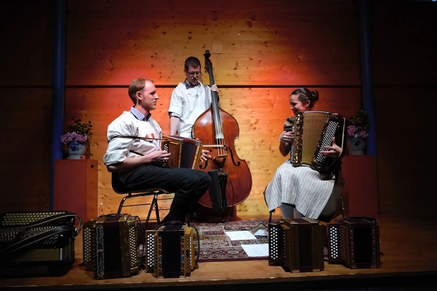 La sala dalle pareti di legno di Soazza ha fatto da cassa di risonanza per le note scaturite da organetti, fisarmoniche e contrabbasso suonati magistralmente da Lea Engler, Florin Schmidig ed Erich Bürgler, un trio di musica popolare svizzero-tedesca.