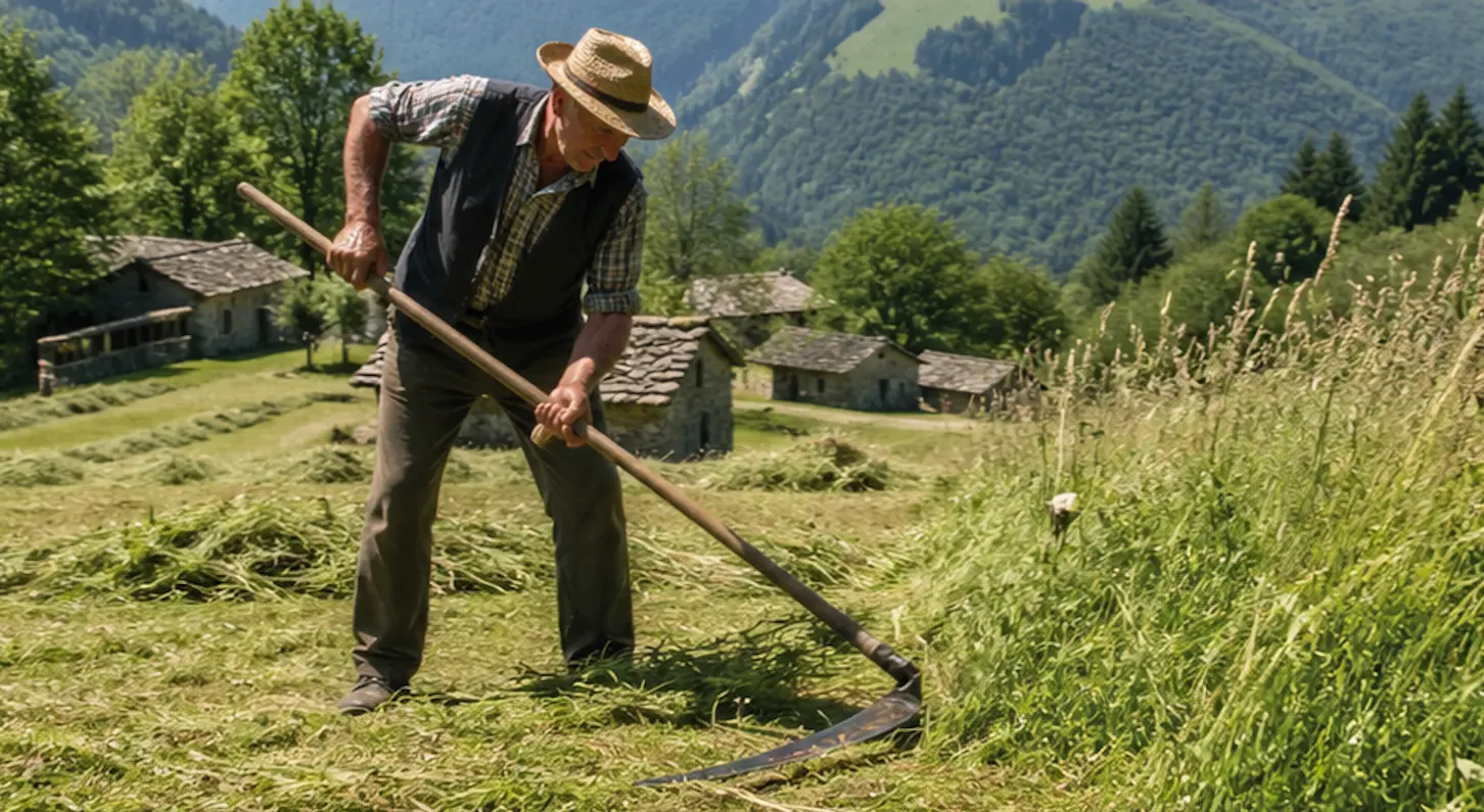 Ai tempi il taglio si faceva a forza di braccia e con la sola falce continuamente aguzzata e oggi risulta incredibile come potessero reggere per l’intera giornata quell’alzare e abbassare la lama, fatica immane sino a sera quando tutta l’erba dei prati era a terra.