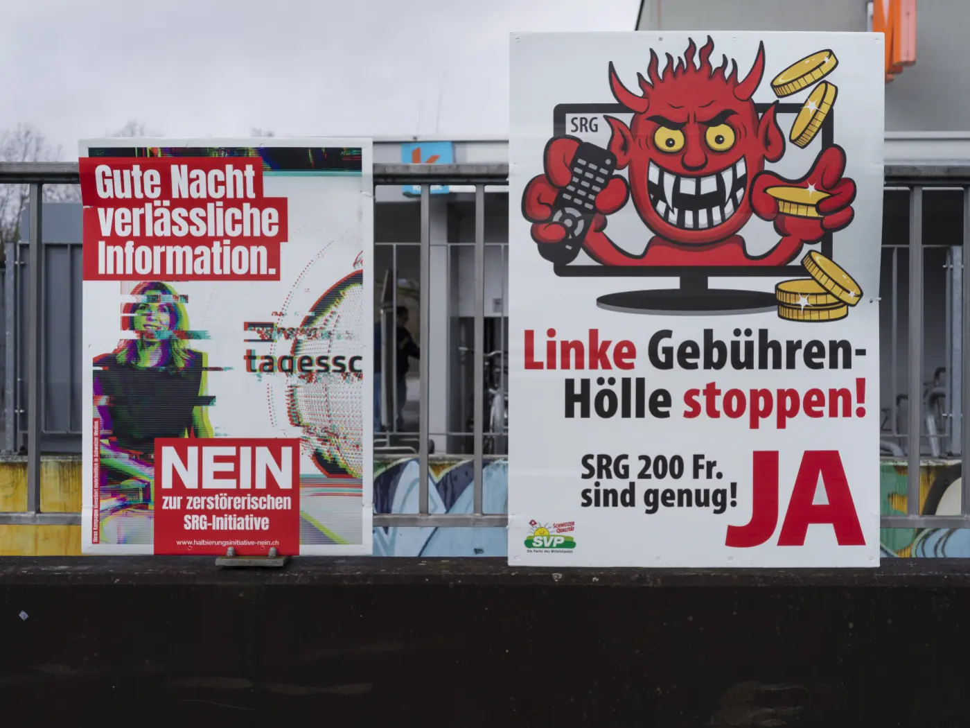 Manifesti politici affissi su un muro. A sinistra, un manifesto con la scritta "Buona notte, informazioni affidabili" e "NO" a un'iniziativa. A des